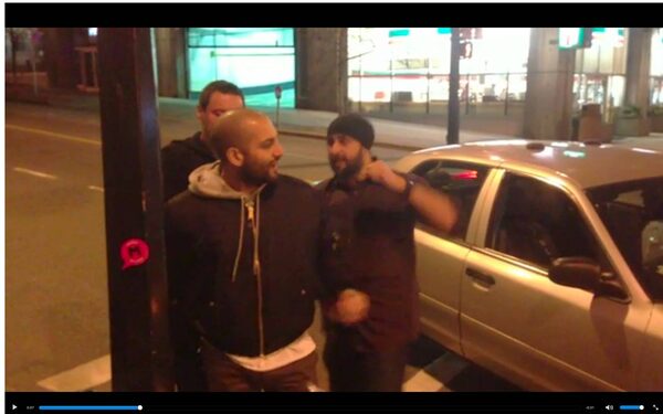 Const. Ismail Bhabha (right) winds up to punch a man in the face in March 2013. Const. Bhabha is still on patrol in spite of being convicted of assault in relation to the incident.