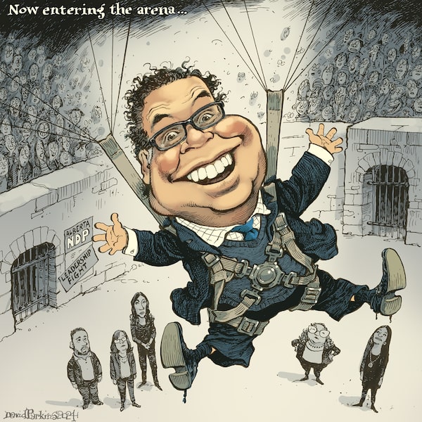 Editorial cartoon by Michael De Adder published March 2, 2024. LAW & ORDER TORONTO. HE WAS TAXED TO DEATH. FIFA WORLD CUP COSTS CLIMB.Michael De Adder/The Globe and Mail