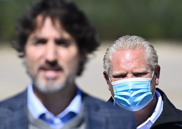Prime Minister Justin Trudeau and Ontario Premier Doug Ford take part in a ground breaking event at the Iamgold Cote Gold mining site in Gogama, Ont., on Sept. 11, 2020.Nathan Denette/The Canadian Press