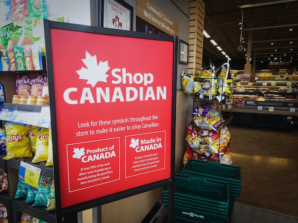 Close-up of 'Shop Canadian' poster displayed in a store in Edmonton, on March 27.Artur Widak/Reuters
