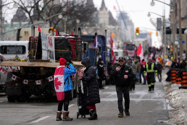 Protesters converse in the street on the 15th day of the protest against COVID-19 restrictions that has grown into a broader anti-government protest, in Ottawa, on Feb. 11.Justin Tang/The Canadian Press