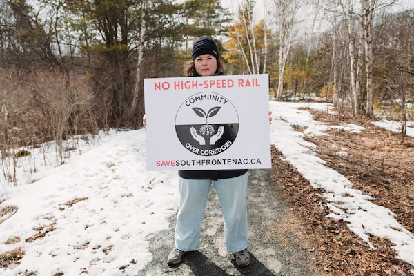 Katie Koopman, a co-lead for Save South Frontenac citizen-led advocacy group, holds a protest sign along the Cataraqui Trail where the tracks of the Toronto-Quebec City high-speed rail line could possibly go through.Kaja Tirrul/The Globe and Mail