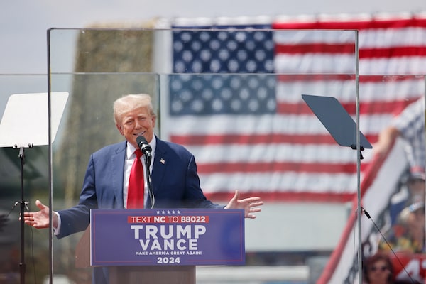 Republican presidential nominee and former U.S. President Donald Trump speaks from behind bulletproof glass during a campaign rally in Asheboro, N.C. on Aug. 21.Jonathan Drake/Reuters