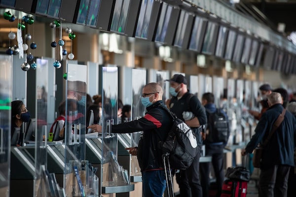 Passengers check in for flights to the U.S. at Vancouver International Airport, in Richmond, B.C., on Dec. 2, 2021.DARRYL DYCK/The Canadian Press