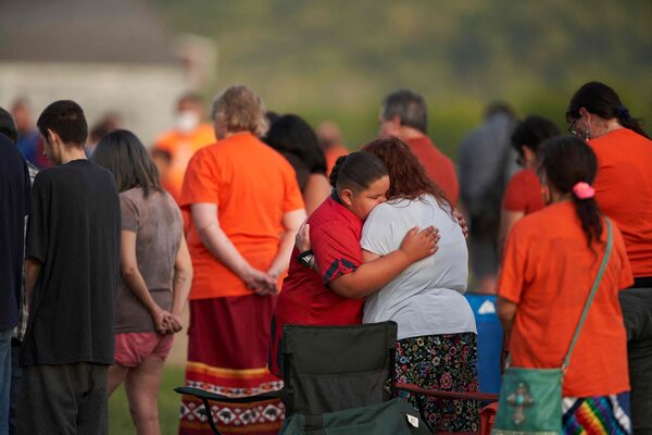 People hug during a vigil in a field where human remains were found in unmarked graves at the site of the former Marieval Indian Residential School on the Cowessess First Nation in Saskatchewan on June 26, 2021.GEOFF ROBINS/AFP/Getty Images
