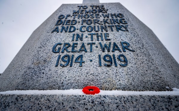A poppy rests on a cenotaph marking the fallen from the First World War following a Remembrance Day service in Calgary, Sunday, Nov. 11, 2018.Jeff McIntosh/The Canadian Press