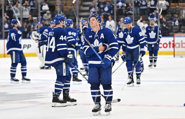 Maple Leafs forward Mitch Marner (16) and team mates react after losing in overtime to the Florida Panthers and being eliminated in the second round of the 2023 Stanley Cup Playoffs at Scotiabank Arena in Toronto on May 12.Dan Hamilton/USA TODAY Sports via Reuters