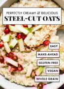 You’ll find my go-to steel-cut oat cooking method below. The only hard part is deciding what to mix in and how to top your oatmeal. Looking for inspiration? Here are my official variations: Apple Steel-Cut Oatmeal, Morning Glory Oatmeal and Cranberry Orange Steel Cut Oats.