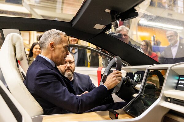 Prime Minister Mark Carney sits in the Project Arrow 2.0 electric vehicle as he tours auto parts manufacturer Martinrea Industries in Woodbridge, Ont.Carlos Osorio/Reuters