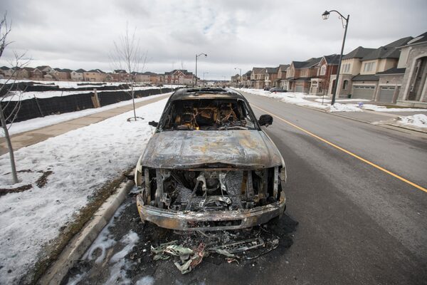 The burned remains of a tow truck on Hartwell Way in Aurora, Ont., in February, 2020.Fred Lum