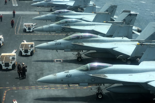 F/A-18F aircrafts are seen on the deck of USS Abraham Lincoln in the Gulf of Oman near the Strait of Hormuz on July 15, 2019.AHMED JADALLAH/Reuters