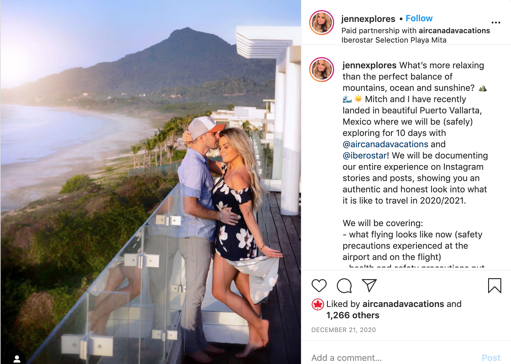 An Instagrammer who goes by the name Mitch_Explores posts for Air Canada and other companies along with his travel partner, Jennifer Fast. The two posted photos from Mexico over the Christmas break promoting Air Canada Vacations and Iberostar Hotels and Resorts.