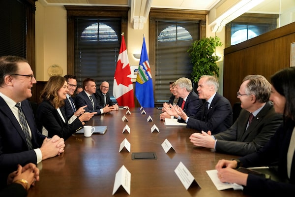 Prime Minister Mark Carney with Alberta Premier Danielle Smith in Calgary on Thursday. Both governments said the deal positions Canada as an energy superpower while meeting environmental goals.Todd Korol/Reuters