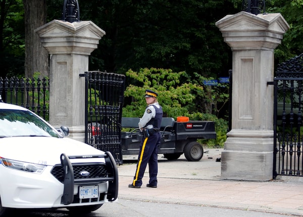 A police officer stands near a damaged gate at Rideau Hall, the property where Canadian Prime Minister Justin Trudeau lives, after an armed man rammed the gate with a pickup truck to gain access to the grounds in Ottawa, July 2, 2020.PATRICK DOYLE/Reuters