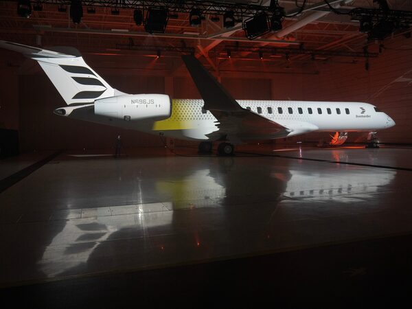 Bombardier's new logo is projected onto a Global 7500 aircraft during an unveiling ceremony at their plant on April 24, 2024 in Montreal.Ryan Remiorz/The Canadian Press
