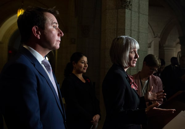 Status of Women Minister Maryam Monsef and Treasury Board President and Digital Government Minister Scott Brison look on as Employment, Workforce Development and Labour Minister Patricia Hajdu speaks during a pay equity announcement in Ottawa, on Oct. 29, 2018.Adrian Wyld/The Canadian Press