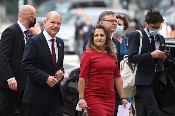 Finance Minister Chrystia Freeland, centre, walks with German Finance Minister Olaf Scholz, left, outside the International Monetary Fund headquarters in Washington, D.C., on Oct. 13, 2021, during the IMF/World Bank annual meetings.JIM WATSON/AFP/Getty Images