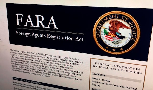The United States’ Foreign Agents Registration Act (FARA) is much older and requires 'agents of foreign principals who are engaged in political activities' to disclose their actions.Jon Elswick/The Associated Press