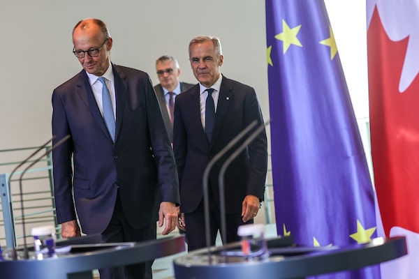 German Chancellor Friedrich Merz (left) and Canada's Prime Minister Mark Carney arrive for a joint press conference on Tuesday in Berlin.Omer Messinger/Getty Images
