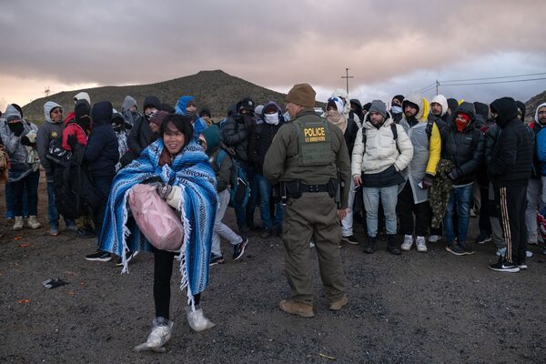 Asylum seekers are processed by border patrol agents at an improvised camp near the U.S.-Mexico border in eastern Jacumba, Calif. on Feb. 2.GUILLERMO ARIAS/Getty Images