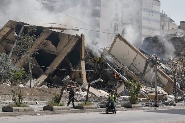 Men pass a building destroyed in an Israeli air strike in Dahiyeh, in the southern suburbs of Beirut on Tuesday.Bilal Hussein/The Associated Press