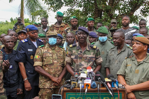 Colonel-Major Ismael Wague, centre, spokesman for the soldiers identifying themselves as the National Committee for the Salvation of the People, speaks during a news conference at Camp Soudiata in Kati, Mali, on Aug. 19, 2020, one day after President Ibrahim Boubacar Keïta was forced to resign in a military coup.Arouna Sissoko/The Associated Press