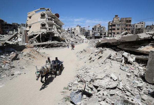 Palestinians ride a cart past the rubble of houses, in Gaza City, May 20, 2025.Mahmoud Issa/Reuters