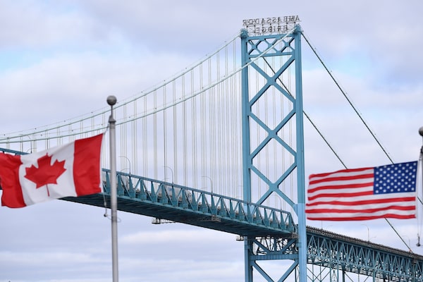 Flags fly near the Ambassador Bridge at the Canada-U.S. border crossing, in Windsor, Ont., on March 21, 2020.Rob Gurdebeke/The Canadian Press