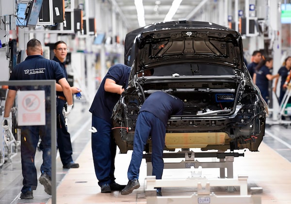 BMW's employees are pictured working on a BMW car assembly process in a guided visit during the inauguration of the new BMW car production plant in San Luis Potosi, Mexico, on June 6, 2019.ALFREDO ESTRELLA/AFP/Getty Images