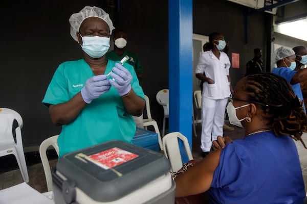 A woman waits to receive one of Nigeria's first coronavirus vaccinations, provided through the global COVAX initiative, in March 2021.Sunday Alamba/The Associated Press