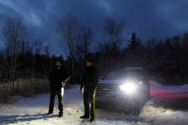 RCMP officers stand at Roxham Road in Hemmingford, Que., during a December patrol along the Canada-U.S. border. Many asylum seekers once used Roxham Road for a legal loophole to enter Canada, which has since closed: Authorities are now ordered to turn people back from here.Carlos Osorio/Reuters