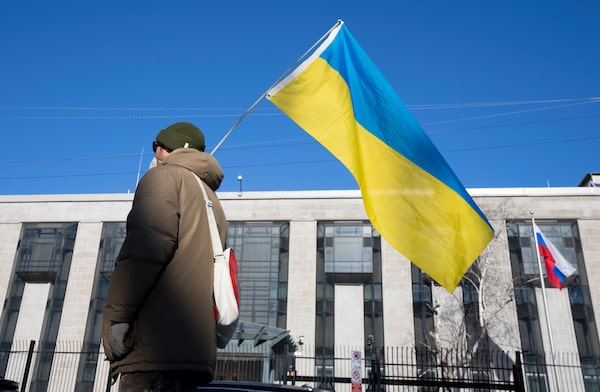 A pro-Ukrainian supporter waves the country's flag outside the Russian embassy in Ottawa on Feb. 24.Adrian Wyld/The Canadian Press