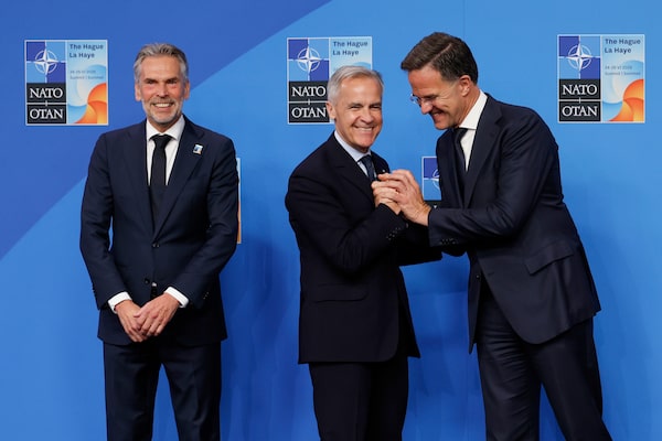 Prime Minister Mark Carney is greeted by NATO Secretary General Mark Rutte, right, and Prime Minister of the Netherlands Dick Schoof at the NATO summit Wednesday.Geert Vanden Wijngaert/The Associated Press