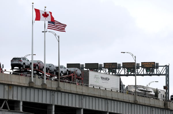 Commercial trucks cross the Lewiston-Queenston Bridge border into the United States on Feb. 4 from Niagara Falls, Canada.Joe Raedle/Getty Images