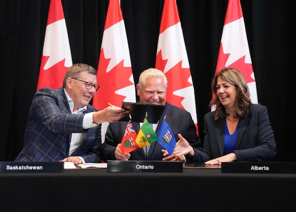 From left: Saskatchewan Premier Scott Moe, Ontario Premier Doug Ford and Alberta Premier Danielle Smith sign a memorandum of understanding during the 2025 summer meetings of Canada's Premiers at Deerhurst Resort in Huntsville, Ont., on Tuesday.Nathan Denette/The Canadian Press
