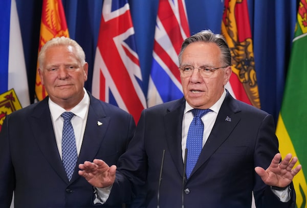 Mr. Legault, right, speaks to the media with Ontario Premier Doug Ford during the 2025 summer meetings of Canada’s Premiers at Deerhurst Resort in Huntsville, Ont., Tuesday.Nathan Denette/The Canadian Press