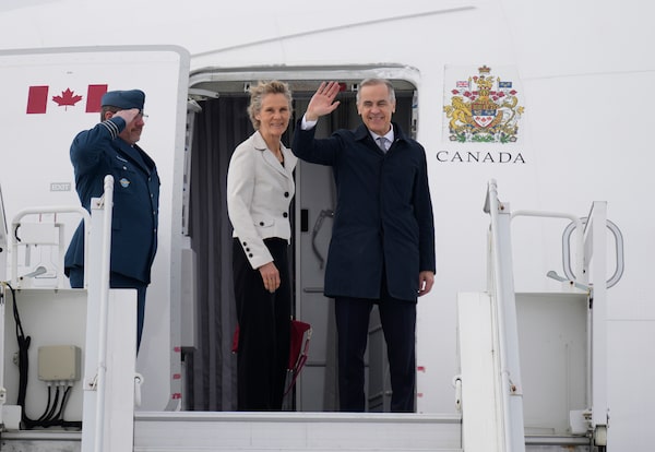 Prime Minister Mark Carney and Diana Fox Carney board a government plane in Ottawa on Thursday to begin their trip to Asia.Adrian Wyld/The Canadian Press