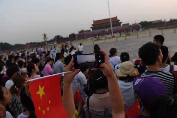 People take photos after the flag-raising ceremony at dawn in Beijing's Tiananmen Square on July 24, 2019, after the death of former Chinese premier Li Peng.GREG BAKER/AFP/Getty Images