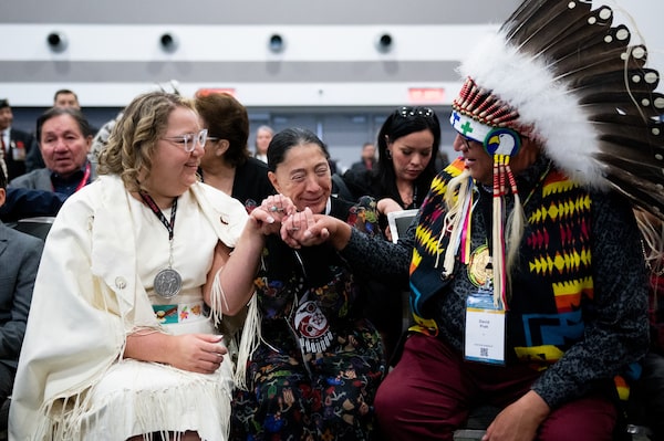 Cindy Woodhouse, left, interim National Chief Joanna Bernard, centre, and David Pratt, are seen during the third day of the Assembly of First Nations Special Chiefs Assembly (SCA) in Ottawa, on Thursday.Spencer Colby/The Canadian Press