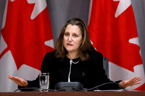 Canada's Deputy Prime Minister Chrystia Freeland attends a news conference on the coronavirus disease outbreak on Parliament Hill in Ottawa, on March 19, 2020.BLAIR GABLE/Reuters