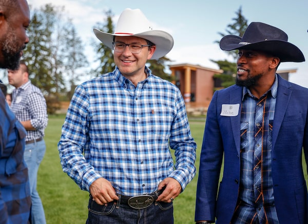 Conservative leadership front-runner Pierre Poilievre attends a party barbecue in Calgary on July 9. He faces a $50,000 fine from the party for skipping the debate.Jeff McIntosh/The Canadian Press