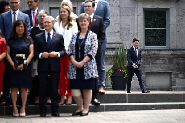 Members of the federal cabinet stand as Prime Minister Justin Trudeau arrives to speak at a media availability after a cabinet swearing-in ceremony at Rideau Hall in Ottawa on July 26.Justin Tang/The Canadian Press