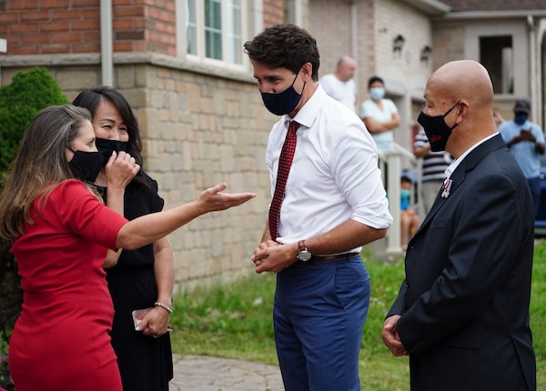 Liberal Leader Justin Trudeau makes a campaign stop in Markham, Ont., on Aug. 17, 2021. He is joined by Liberal candidate for Markham-Unionville, Paul Chiang and wife Monica, and Liberal candidate for University-Rosedale, Chrystia Freeland.Sean Kilpatrick/The Canadian Press