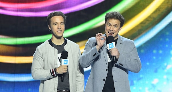 Co-founders of WE Charity Craig Kielburger and Mark Kielburger speak on stage during WE Day California at the Forum in Inglewood, California on April 25, 2019.VALERIE MACON/AFP/Getty Images