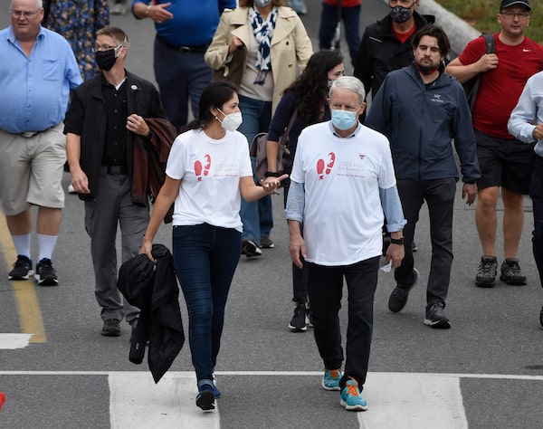 Vina Nadjibulla, wife of Michael Kovrig, speaks with Minister of Foreign Affairs Marc Garneau, as they walk during the March for the Michaels in Ottawa on Sept. 5, marking 1,000 days since Canadians Michael Kovrig and Michael Spavor were detained in China.Justin Tang/The Canadian Press