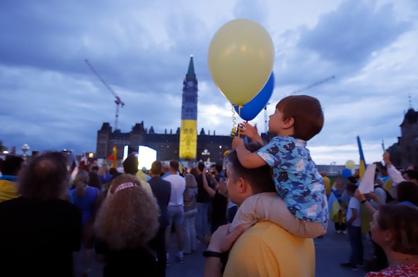 The Parliament Buildings are illuminated in the colours of the Ukraine flag as people take part in Ukrainian Independence Day celebrations on Parliament Hill in Ottawa on Aug. 24.PATRICK DOYLE/The Canadian Press