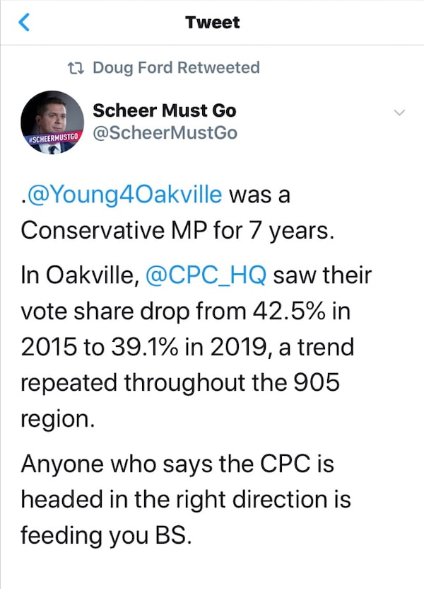 Mr. Ford’s official Twitter account retweeted a fledgling organization called “Scheer Must Go," which is advocating for the federal Conservative Leader’s ouster after a disappointing election result last week.