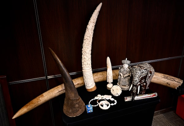 Items made of ivory and a rhino horn, front left, part of the collection of confiscated items held by Environment and Climate Change Canada, on display during a news conference on the implementation of stricter measures to regulate the trade of certain wildlife items, particularly elephant ivory and rhinoceros horn, in Ottawa on Nov. 20.Justin Tang/The Canadian Press
