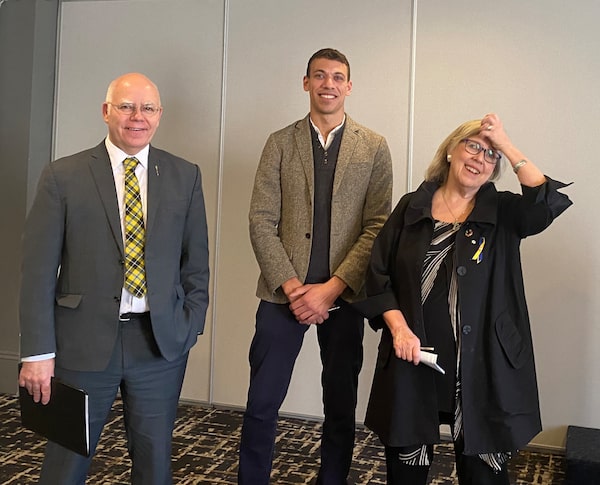 Federal Green Party Leader Elizabeth May, deputy leader Jonathan Pedneault (centre) and David Coon, New Brunswick Green Party leader, attend a news conference in Fredericton on Jan. 27, 2023.Hina Alam/The Canadian Press