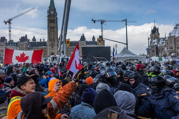 Police face off with demonstrators participating in a protest organized by truck drivers opposing vaccine mandates on Wellington St. on Feb. 19, 2022, in Ottawa.Alex Kent/Getty Images